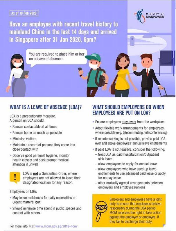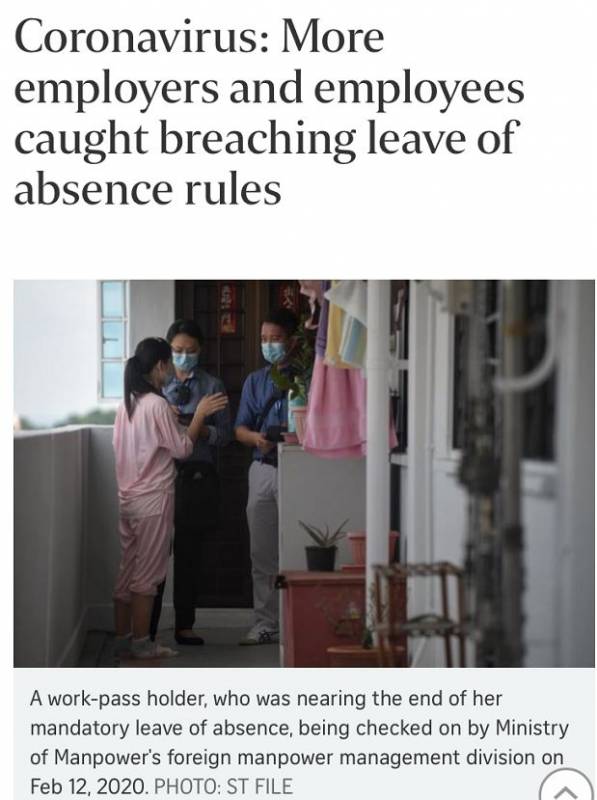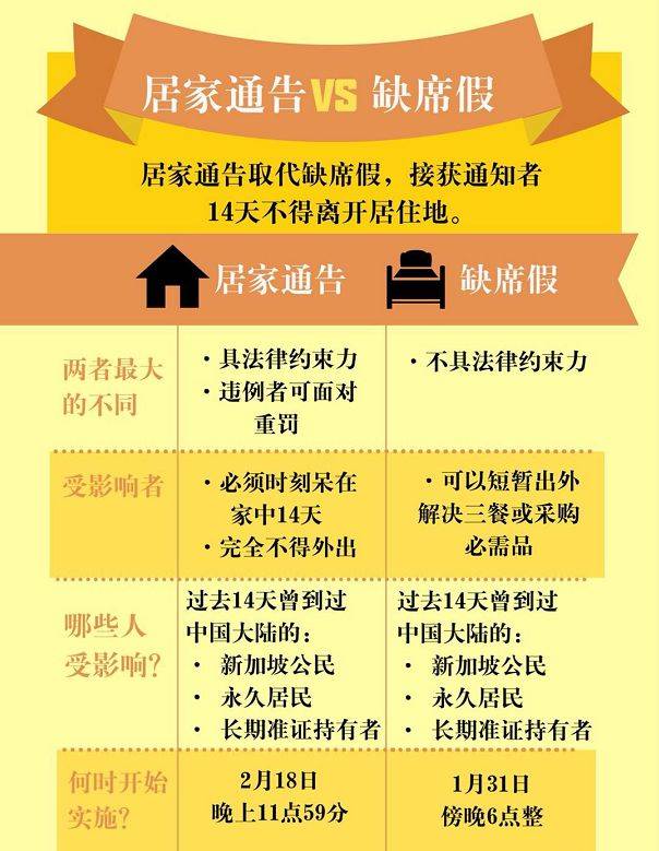 缺席令:14天内到过中国的员工,回到新加坡后不能马上工作,要居家隔离两周后才能返回办公室工作,只能去公共场合短暂停留,吃饭买菜等。现在缺席令已被居家通告所代替。