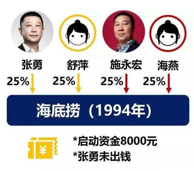 据张勇后来回忆说,创业之初,他和施永宏各拿4000元开火锅店,股份各占50%,非常公平。