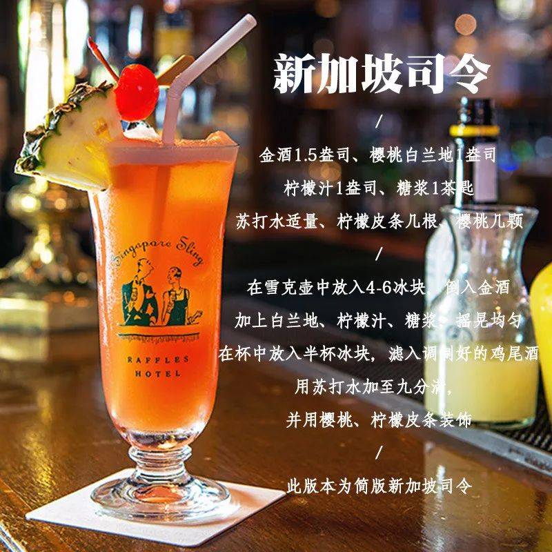 5.新加坡司令新加坡司令最早是由一位海南籍华裔酒保严崇文在 1915 年左右发明的鸡尾酒。这位酒保当时在新加坡最标志性酒店之一——莱佛士酒店的 Long Bar 里调酒,应客人要求改良琴酒,用菠萝汁等原料调制出口感酸甜的味道。