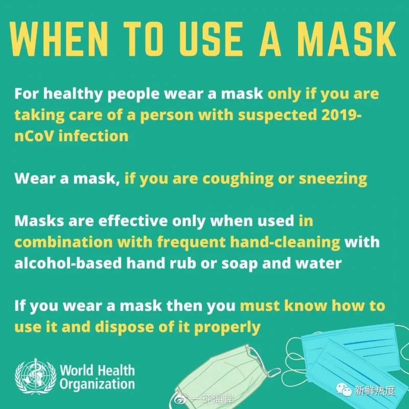 下图是世卫官方的宣传海报,对于非医疗工作者的普通人不要戴口罩,只推荐已确诊的病人,或者因其他原因正在咳嗽或打喷嚏的人使用口罩。