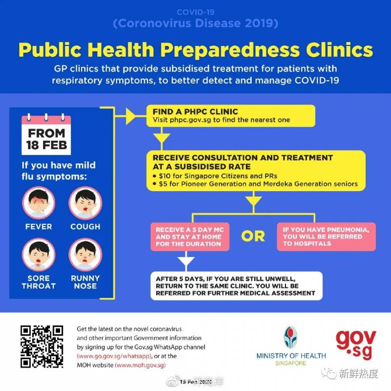 新加坡在之前抗击SARS和H1N1中积累了经验,在全岛指定了大约800多家PHPC(公众健康预备诊所),在疫情期间已全部启用,如果任何人有感冒类似症状都应该去PHPC就诊。