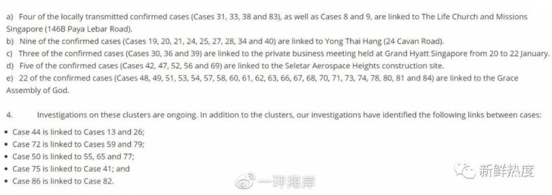 新加坡目前对病例传播链的追索显示,主要病例来源一是来自中国的输入型案例,二是本地四起集中传播事件(神召会恩典堂、基督生命教会、永泰行、实里达工地、君悦大酒店会议),以及若干计程车司机、赌场酒店职员、银行员工等传染关系未明确的发病案例。