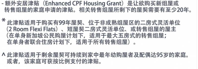 额外安居津贴计划取代之前的特别公积金购屋津贴( Special CPF Housing Grant)和额外公积金购屋津贴(Additional CPF Housing Grant)。