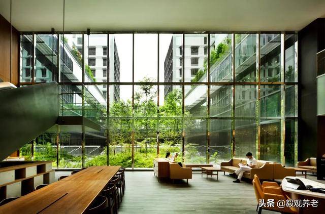 社区充分考虑人与自然的亲近感,处处绿植覆蓋,绿化面积甚至比占地面积还大。建筑内部尽可能保留自然光线和自然通风,增加窗户,使不便行动的老人也感受室外的绿色。