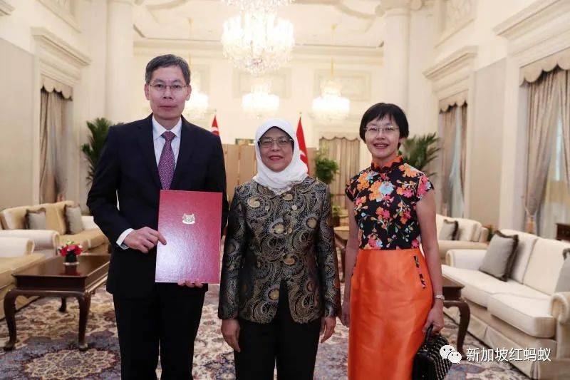 哈莉玛总统(中)在去年10月30日将外交国书颁布给新任新加坡驻华大使吕德耀(左一),并与他和他妻子合照。(通讯及新闻部提供)