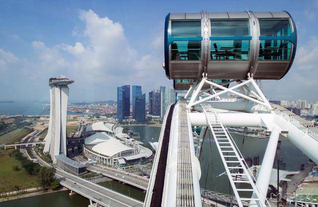 新加坡摩天观景轮·新加坡摩天轮的高度为165米,相等于42层楼,是亚洲目前最高的摩天轮。 ·28个安装了空调的座舱可以分别容纳28名乘客,也可以包厢独自与情侣享用摩天轮的丰盛餐点。 ·旋转一周约用30分钟时间,不仅能够360°鸟瞰新加坡的城市景观,还可以远眺直到约45公里外的景色。 ·大楼中庭还有一座郁郁葱葱的热带雨林,雨林内的瀑布、小溪、岩石堆等绘成一幅幅供摄影的如画景观。