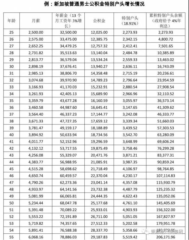 为了弄清楚新加坡人是否存在养老问题这个问题,我们设想了一个普通新加坡男士在现行公积金制度下的情景。大专或者本科毕业,7岁入学,当兵二年,25岁完成教育,开始工作。起薪为2500元新元,年薪3%的增长。每月公积金为37%的月薪,其中18.91%会进入特别户头,用于养老的储蓄,政府给予4%的年利率。以下这个表格体现在他从25岁到55岁特别户头积累的情况。