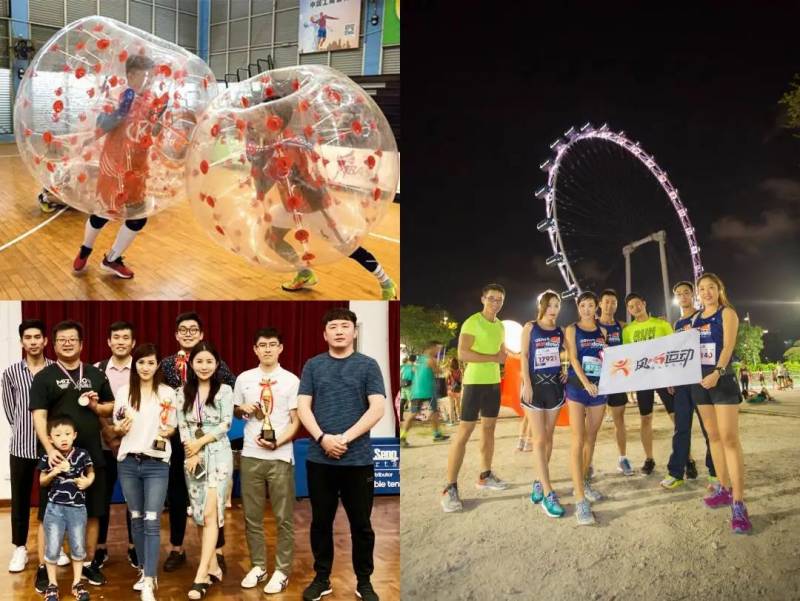 风尚运动群的组员除了参加 2016 年的日落马拉松(右),还参与 2019 年新加坡宗乡会馆联合总会举办的体育节,并在泡泡足球赛的环节分别取得第一与第三名(左)