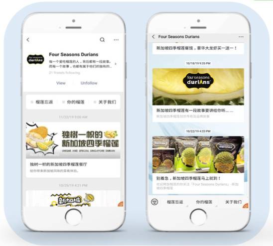 新加坡本地急速冷冻榴梿品牌“四季榴梿”和移动摄影吧台“Happy Gorillas”在与点点客平台合作后,将线上销售及展示平台嵌入公众号中,真正做到了宣传与销售有机结合。