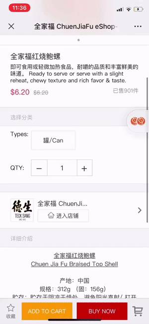 通过点点客创建的微商城,只需点击连结即可在微信平台打开。首页的产品展示界面清晰,功能明确。点击列表中的商品,即进入产品描述界面,商家可以根据自己的需要进行编辑,可以随时修改。