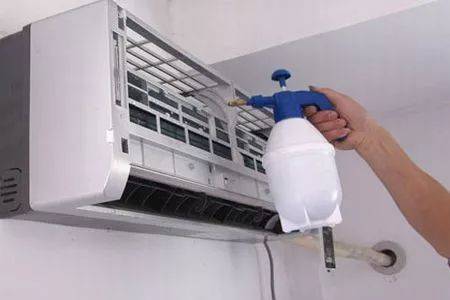 开启制冷,产生冷凝水后关机。将专用空调清洗剂均匀地喷洒在蒸发器翅片上,等待10-20分钟。