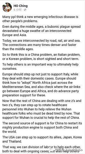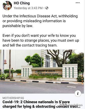 李显龙夫人何晶在脸书上科普了新加坡《传染病法》,并教育所有人都应向政府如实交代旅行史:“即使你不想让妻子知道去了奇奇怪怪的地方,也必须向追踪感染途径的政府人员坦白行踪。”
