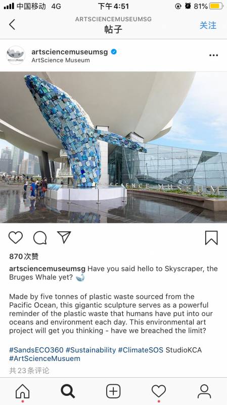 在滨海湾艺术科学博物馆门前展出的这头跃出海面的鲸鱼,就是使用5吨从太平洋里面找到的塑料垃圾制作出来的。警醒人们,对于塑料的再利用和回收是刻不容缓的事情,减少塑料制品的使用,亦是全世界人们的当务之急。