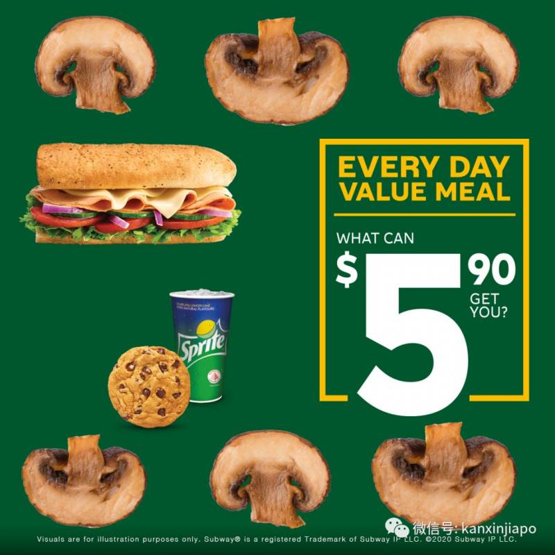现在,一顿丰盛的套餐包括6寸鸡肉蘑菇搭配饼干跟饮料只需5.90新币!