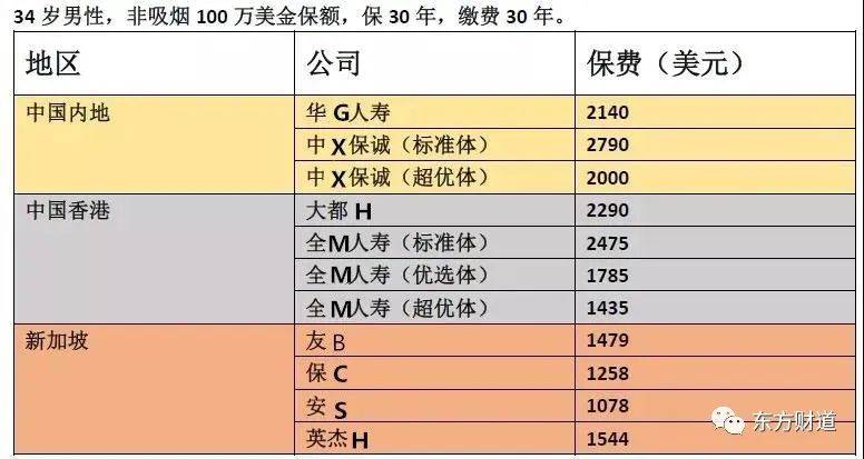 表格数据一眼看出新加坡定期寿险的价格是中国内地和中国香港的一半左右,原因是得益于新加坡政府的大力推广。