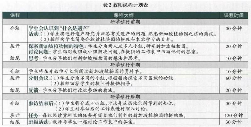 教师课程计划:为教师提供计划表,分为研学旅行前期、中期、后期三个部分,保证学生的研学之旅行顺利进行(详细内容参见表2)。