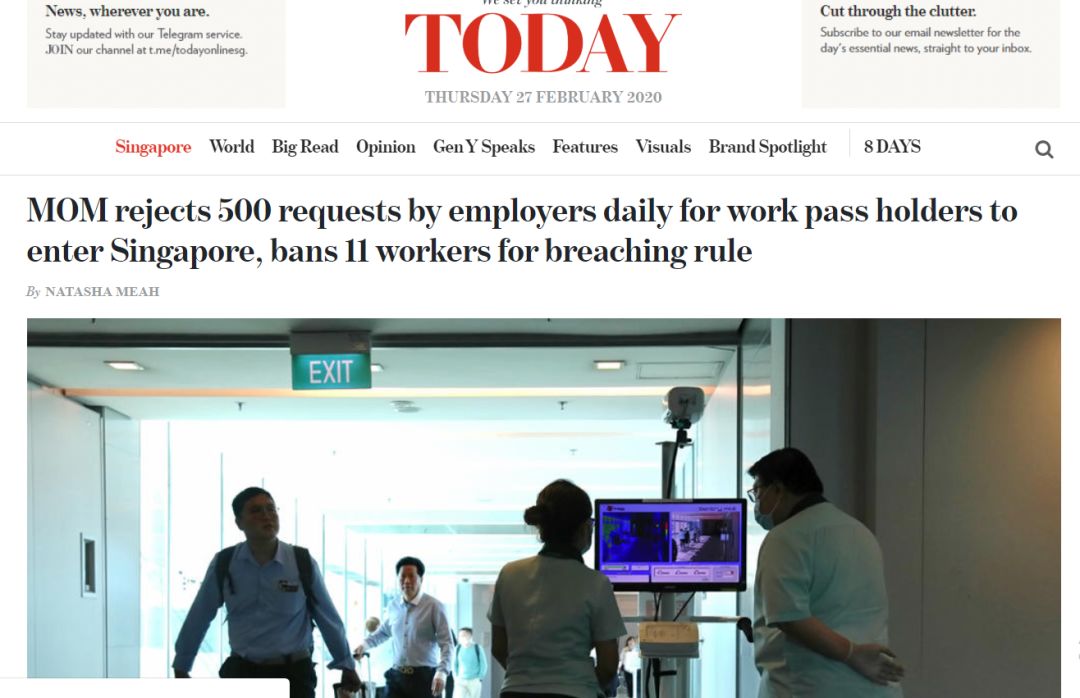 目前,14天内在中国大陆逗留过的新加坡工作准证持有人,想要回新加坡,都必须提前向人力部MOM提交入境申请。根据人力部发表的文告,措施实施到现在当局每天平均批准220份相关申请,但还有500份申请被拒绝。