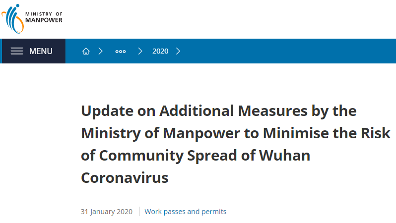 新加坡人力部1月31日通知:为配合卫生部对武汉肺炎(2019新型冠状病毒肺炎)疫情的额外措施,新加坡人力部将拒绝所有中国大陆员工的工作准证新申请,直到另行通知。目前持有工作准证的中国大陆员工若申请更新准证,将不受影响。现在,持工作准证的中国大陆员工,想要跳槽,要承担割掉旧准证可能无法重新申请的风险。