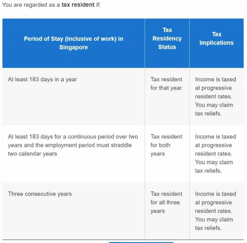 *来源:IRAS1、全年在新加坡居留或工作183天或以上,则是当年的税收居民;2、连续两年内至少在新加坡居留或工作183天或以上,且就业期跨越两年,则属于这两年的税收居民;3、连续三年在新加坡居留或工作,则属于这三年的税收居民。 税收居民的个人所得税税率将按累进税率制缴纳,具体如下: