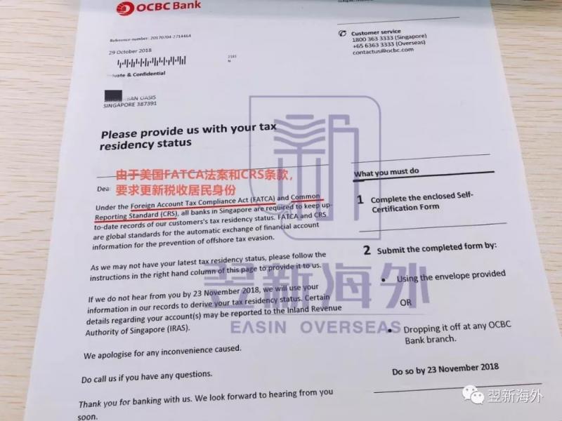 新加坡银行会定期向客户发出信函,信函注明“由于美国FATCA和CRS条款,要求更新税务居民身份”,通过信函确认客户的税务居民身份。