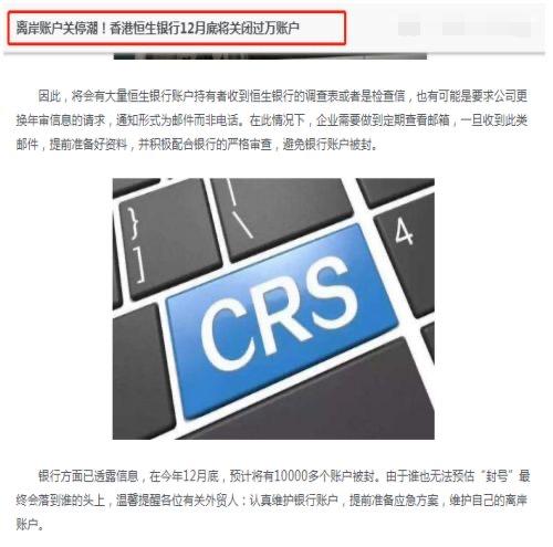 恒生,星展,汇丰,中银等,都开始了账户清理,香港主要是应对全球反洗钱审查以及全球反避税、CRS涉税金融信息交换等,加大了对离岸账户的监管力度。除了针对新成立的公司开户审查严格、开户难;更是对已开立离岸账户展开严格的尽职调查。