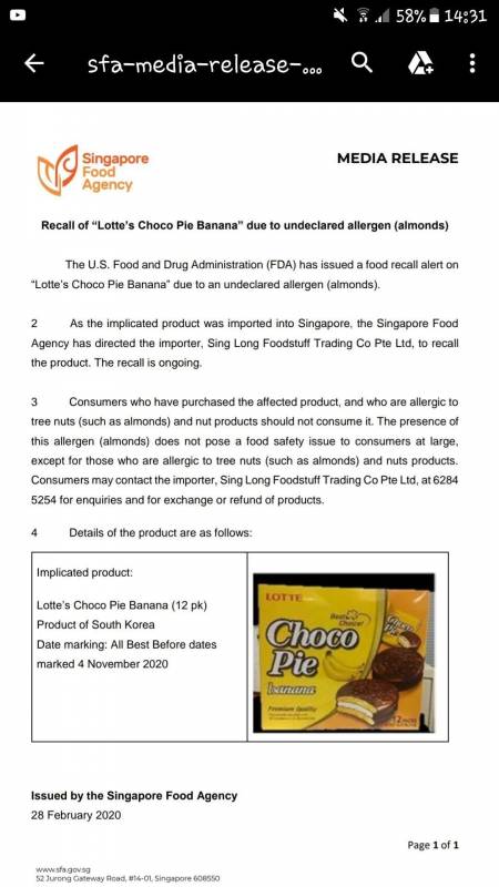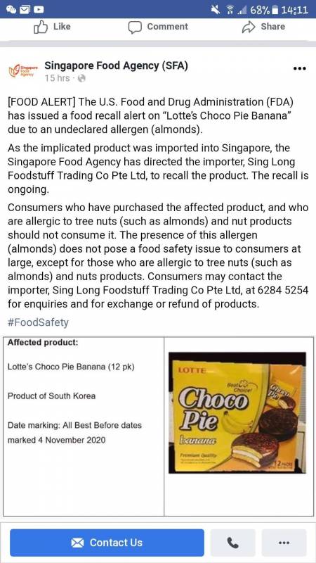 昨日(2月28日)新加坡食品局(STA)发布公告,由于存在未申报的杏仁过敏原,美国食品药品监督管理局已召回产自韩国的乐天巧克力派香蕉味(Lotte Choco Pie Banana)。