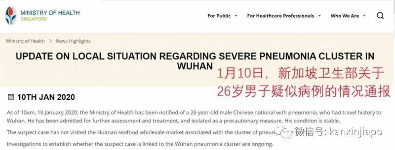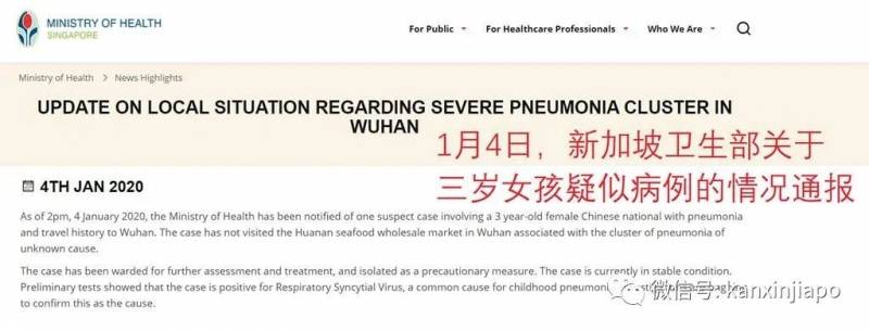 从1月4日开始,尽管尚未出现病例,新加坡卫生部频繁发出有关“新冠病毒”消息与提醒, 包括对学校、幼儿园、医院、老人院等场所的防疫准备要求。卫生部的通报也会详细公布每一起疑似病例的具体情况。