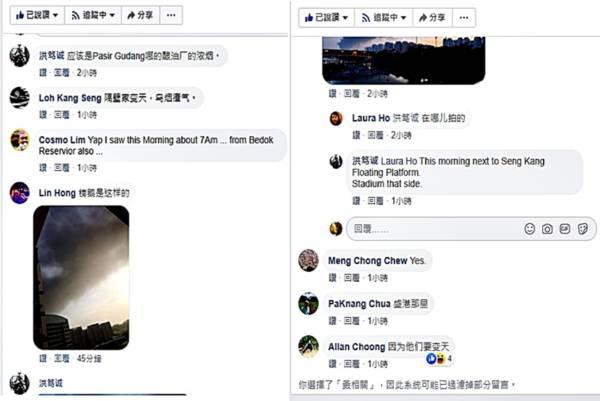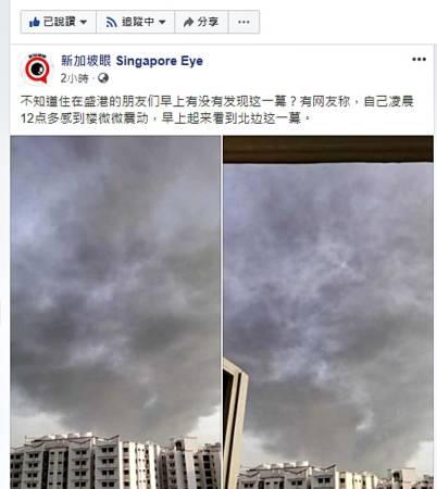 新加坡眼(Singapore Eye)今早8时许,在面子书上贴文,附上两张上空出现“一片黑”的照片,文指“不知道住在盛港的朋友们早上有没有发现这一幕?有网友称,自己凌晨12点多感到楼微微震动,早上起来看到北边这一幕。”