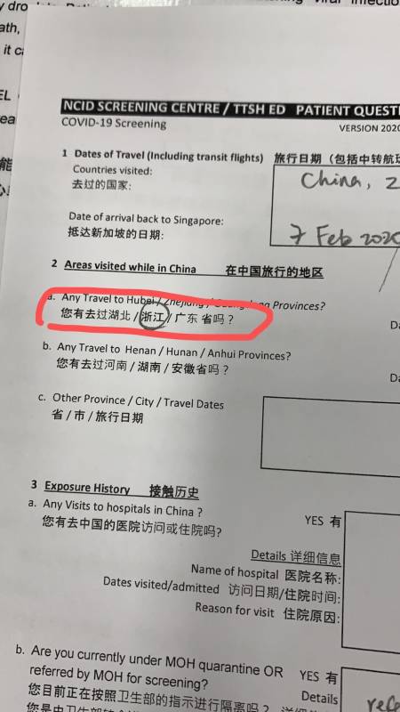 “也许是因为我从浙江回来!”小哈猜测自己之所以被“特别对待”是因为14天内去中国浙江刚到国家传染病中心的时候填过一张表格您有去过湖北/广东/浙江省吗?是的,不仅仅是湖北去过广东和浙江两省的人员也在新加坡重点防疫人群的第一梯队中