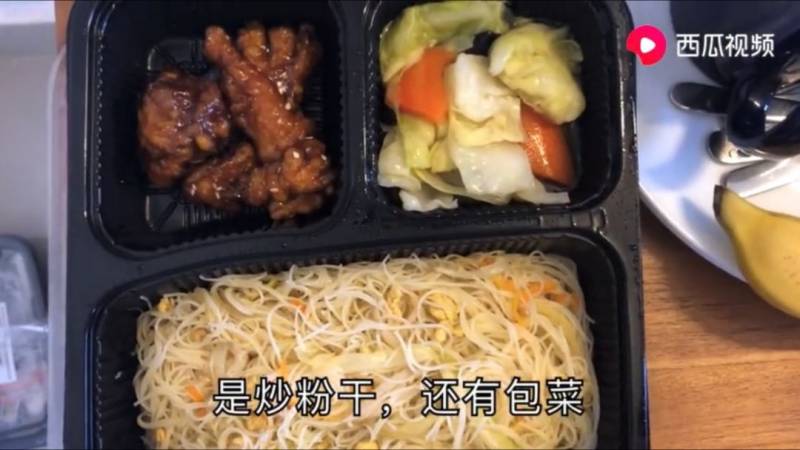 午餐 主食:炒粉干配菜:包菜、糖醋肉水果:香蕉饮料:纯净水