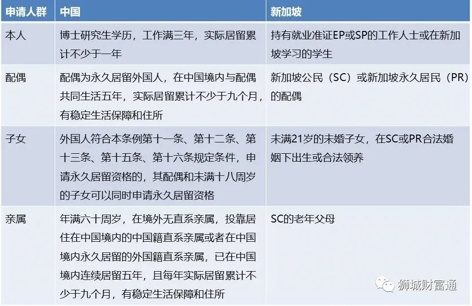 公开征求意见系统其实,引进外国人增加劳动力和预防老龄化,已经是一个公开的战略,新加坡便是此项政策的先行者。我国自建国以来,也从新加坡的诸多政策中受益良多,比如改革开放、住房公积金等。那今天我们不妨再对比一下,中国与新加坡对待永久居民的政策有哪些不同。我们总结了此次草案中被网友热议的几项条例,和新加坡的政策逐一进行对比。需要注意的是,新加坡未将申请的详细条件公之于众,我们提供的新加坡政策尺度是结合了网上各种资料与身边大量实际案例。想要详细了解新加坡永居申请的小伙伴可以点击狮城财富通 | 工作后如何申请PR。