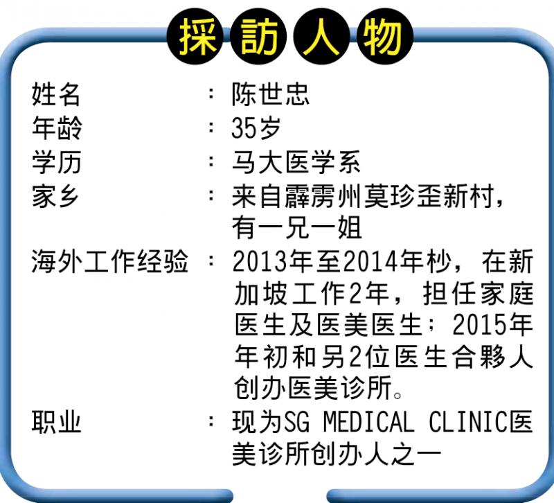 他之后受聘于新加坡一家医疗集团,担任家庭医生,每个月有1万新元(约3万令吉)薪水,之后跳槽到医美集团,薪水连跳三级,每月有2万至3万新元(约6至9万令吉)。