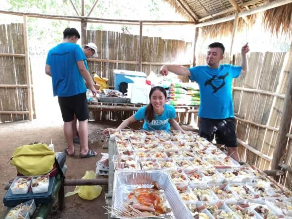 陈世忠(右)和义工们到彭亨的原住民村落,派发及烹煮食物给村民。