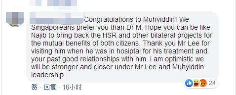 李显龙总理说,“在这些年里,我们有机会多次共事,我相信在慕尤丁的领导下,新马多方面的关系都将得到长远的发展,并造福两国人民。”李总理帖文中还提到,如今全球环境充满挑战,已邀请慕尤丁访问新加坡,将在不久后讨论新马各方面的合作。网友们纷纷看好,慕尤丁上任后,希望“新马两国可以在将来拥有更紧密更强大的关系。”