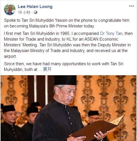 (李显龙和慕尤丁通话时用的是马来语)除了打电话,李显龙昨天(3月1日)还发布脸书恭喜慕尤丁当选,并称他与慕尤丁的相识可以追溯至1985年。35年前,李显龙与时任新加坡贸工部长的陈炎庆(Tony Tan)到吉隆坡参加东盟经济会议,慕尤丁负责到机场迎接他们,那年慕尤丁的职务是马来西亚贸工部副部长。