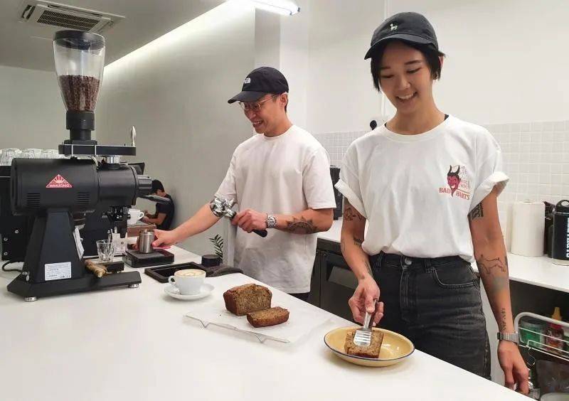 Double Up Coffee创办人林伟龙(左)和符如瑷都是经验丰富的咖啡师。(陈爱薇摄)当然,最重要的还是可以按照自己的想法烘焙和冲泡咖啡,两人希望每一杯咖啡都能反映出他们的个性和理念,哪怕不是每个客人都喝得出来。 两人也认为要有对的产品,但那并不是全部,客人的愉快体验更重要。咖啡馆装潢不多,只准备凳桌,希望客人能够把这个空间当自己家,可以随意移动。他们与客人聊天时的笑容,很暖心。 喜欢烘焙的林伟龙也会亲自制作糕点。采访当天是香蕉蛋糕(一片$3.50),一个卖到所剩无几再烤一个,保证新鲜。 走进百胜楼的Narrative Coffee Stand咖啡馆,也会看到咖啡师在和烤盘打交道,烘制出诱人的香蕉核桃蛋糕、海盐布朗尼和海盐巧克力曲奇($3.50和$4)。在书城邮政局旁的这家咖啡馆店面有些窄促,只用凳椅,但咖啡师、客人、咖啡、蛋糕所构成的画面很和谐舒服。豆子来自Nylon Coffee Roasters。