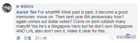 “过去就让它过去,记得那些美好就好。要不然明年6周年纪念要怎么办?再出一套纪念币吗?别再搞这些有的没的!是的,他是新加坡的英雄,但新加坡不是他个人专属的,也不是李显龙(总理)专属的。要搞清楚。”