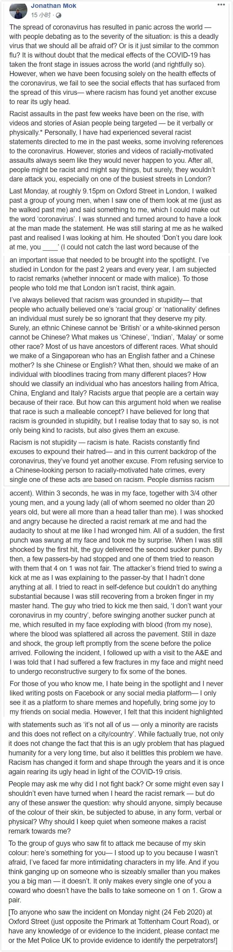 Jonathan Mok原文截图 事情发生在上周一(2月24日)晚上9点15分,当时,Jonathan Mok正在街头散步。 当他走过一群外国的年轻人时,其中一个人看着他,嘴里嘟囔著“新冠肺炎”。Jonathan Mok觉得很莫名其妙,于是看了该男子一眼,结果对方大喊“你竟然敢看我!你这个——”一拳打在他的脸上!Jonathan Mok还没有回过神来,旁边的另一名男子大喊“我不要你们的冠状肺炎在我的国家!”也给了他一拳。