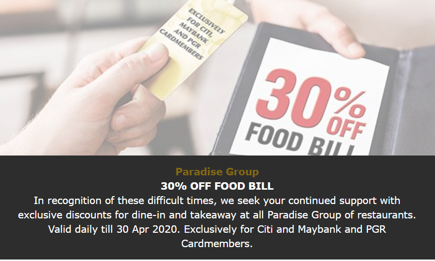 Valid daily at all Paradise Group of restaurants from 3 Mar until 30 Apr 2020, for dine-in and takeaway.