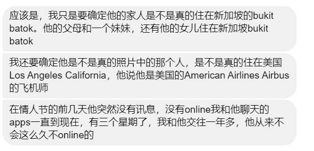 这位名叫Ella的网友在给万事通的求助信中写道:她和她的男朋友在Instagram上认识,情投意合的两人随后展开交往!虽然他们不曾谋面,但是每天都有信息聊天,偶尔男朋友也会打电话给她。