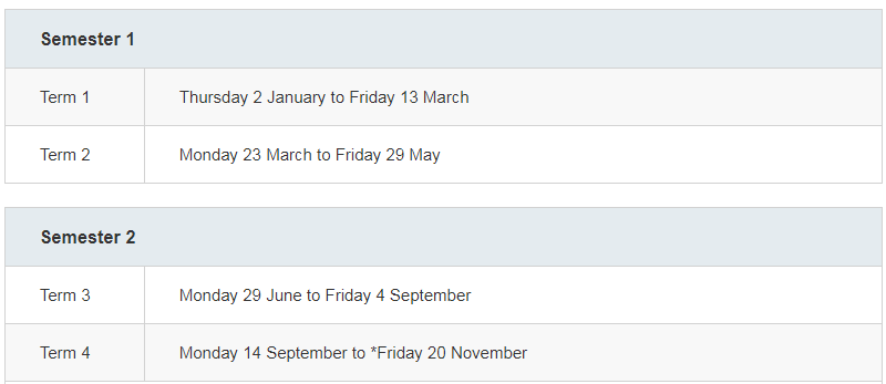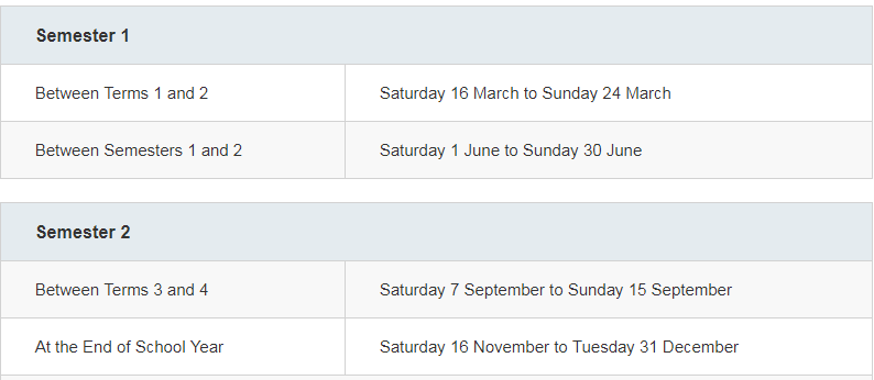中小学学段之间的学校假期分别在3月14日至22日、5月30日至6月28日、9月5日至13日,以及11月21日至12月31日。