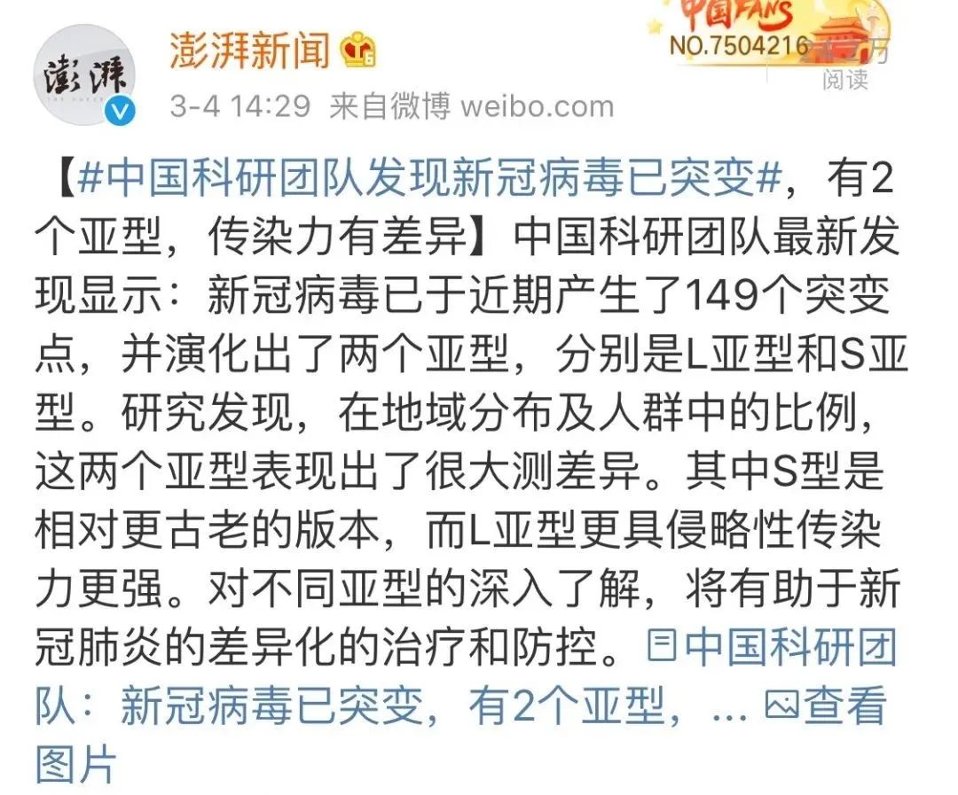 中国科研团队最新发现显示:新冠肺炎病毒已于近期产生了149个突变点!并演化出了2个亚型:L亚型和S亚型。其中S型是相对更古老的版本,而L亚型更具侵略性、传染力更强。