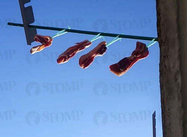 (新加坡5日讯)夫妇用竹竿吊着4大块腊肉,放在晾衣架上晾晒,引发阵阵恶臭,导致邻居不满。