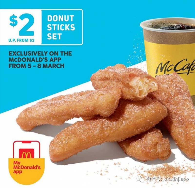时间:3月2日至6日、9日至13日,12pm-6pm(周一至周五)地址:391A Orchard Rd, B2 (Food Hall), Singapore 238873麦当劳 McDonald's原价3新币的甜甜圈棒套餐现在只要2新币~