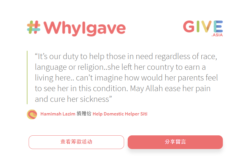 (“无论种族、语言或宗教如何,帮助有需要的人是我们的责任。她离开祖国在这里谋生,无法想像她父母在这种情况下看到她会有多难受,愿真主减轻她的痛苦并治愈她的疾病”--来自一名善良的捐助者)