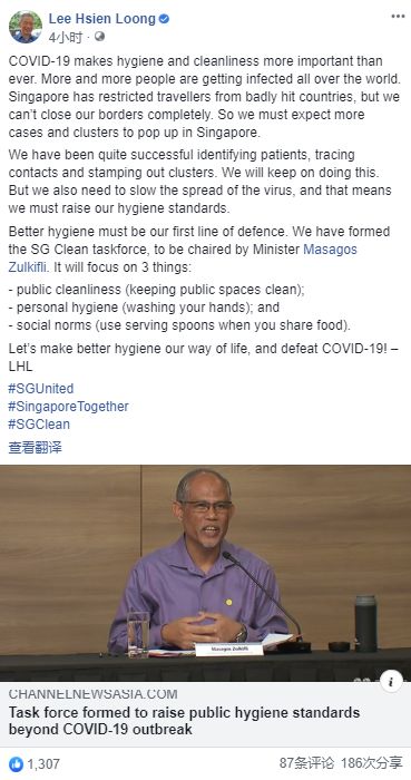 新加坡总理李显龙也在Facebook上也转发了这条消息,李显龙表示新冠病毒使卫生和清洁比以往任何时候都更重要。