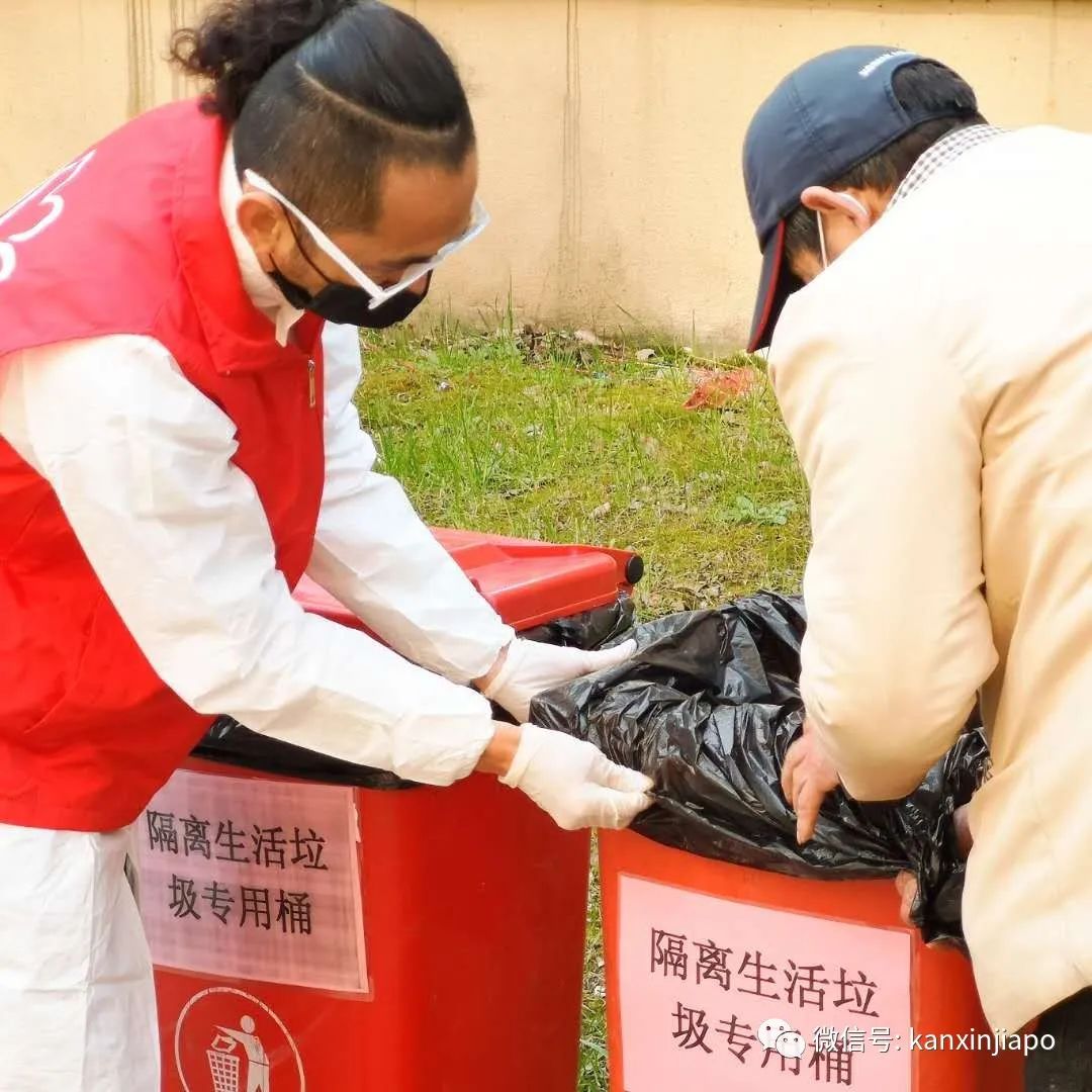 穿着社区发放的工作服,将隔离生活垃圾桶进行更换垃圾袋。