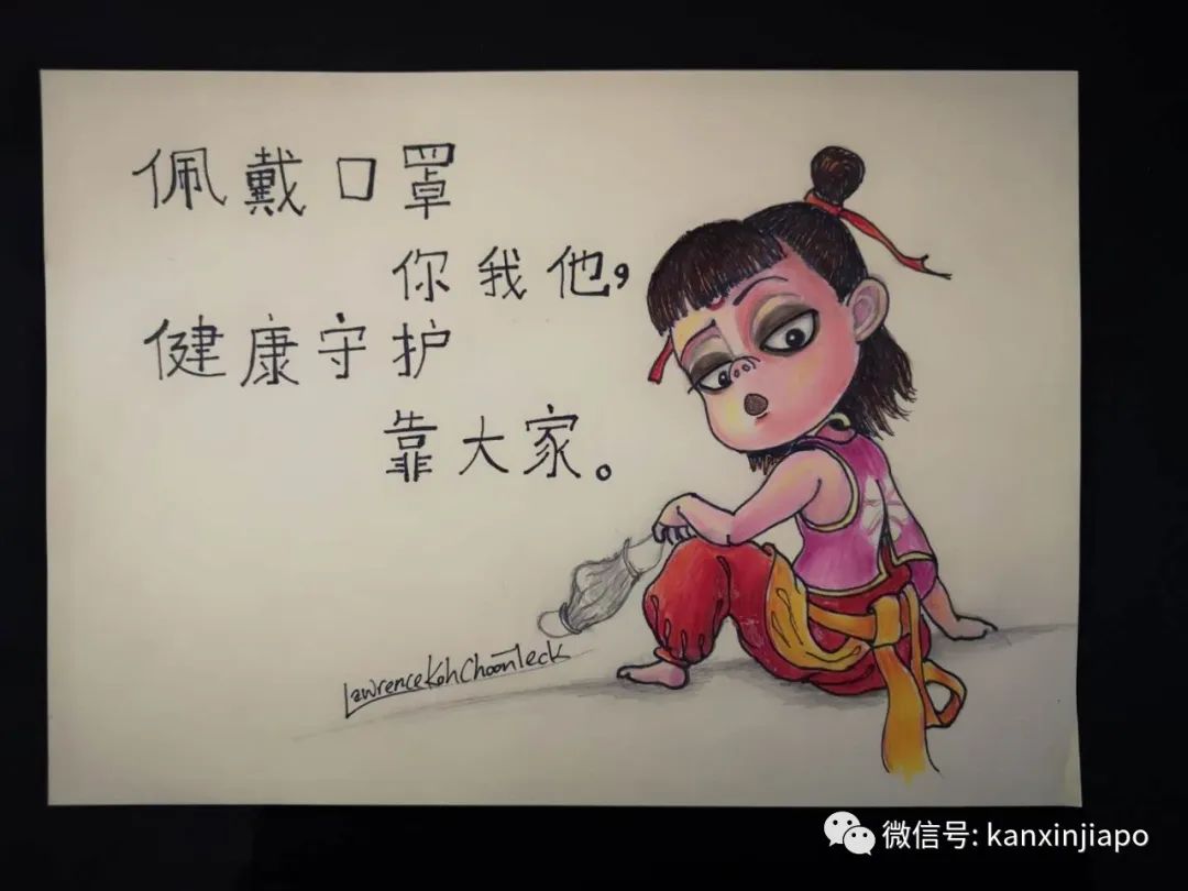 “病毒不会淹没我们我们继续游下去”。这是爸爸Lawrence画的,姐姐Koh Yee写的字~