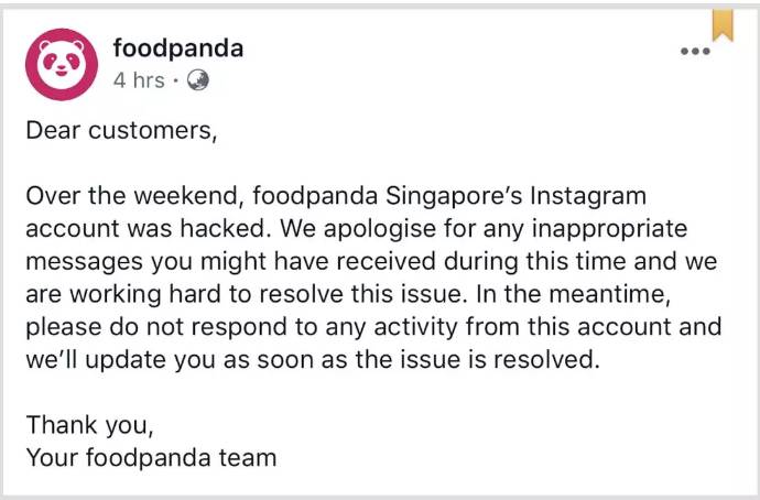 之后,Foodpanda在官方Facebook上发公告,说他们的Instagram账号被盗了...