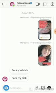 Foodpanda先是发了“F*** you bitch”,然后又发了“Suck my d***”,之后迅速撤回。